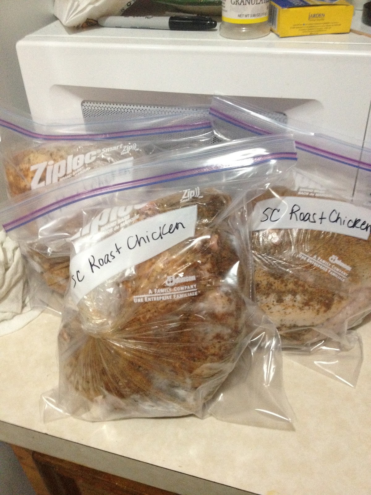 Next, I did the same thing with the rest of the chickens. This time I twirled the top of the slow cooker bag until the chicken was nicely tucked together. Then everything got stuffed into a labeled freezer bag. Now I have three Sunday dinners waiting to be put into the slow cooker.