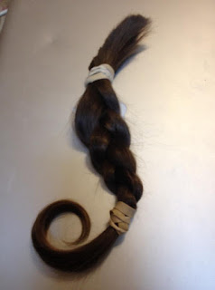 I put Sophie's hair in a low braid and cut it off. Then I trimmed it as best I could. Now my baby looks like this: