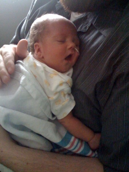 You decided to follow in your sister's footsteps and come at 34 weeks. You added your own flair by not breaking my water, cutting the labor in half - thank you for that - and gasping like a fish out of water in my arms. I had enough time to register abject fear at your blue lips and kiss your head before you were whisked away by the NICU team at 4:38 PM. Around 9:00, your father and I made our way down to the NICU and found you strapped into this lovely little headset. I asked if I could hold you and a nurse gently told me that it probably wasn't a good idea at the time. They were having problems balancing your CPAP machine and the IV in your head and they didn't want you jiggled about. We stayed and stared at you for an hour before taking me back to my room. I was sharing my room with another woman who sat in her bed breastfeeding her chubby little boy. Your daddy couldn't stay with me since it was a shared room. When he left, I laid in my bed burning with fever and shaking with quiet tears as I listened to the baby sounds on the other side of the curtain. Your sister's NICU had been just down the hallway. In this hospital, you had to go down a hallway to the elevators, go down a floor, go through a lobby, another hallway, get onto another elevator and go up two floors before getting to the NICU.